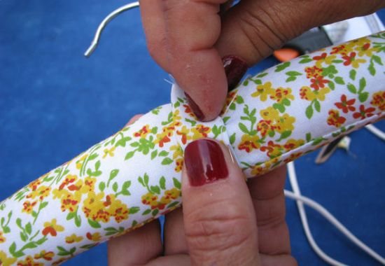 Em seguida, envolva o cabide, sem o gancho, na manta acrílica. E prenda dando pontos à mão.