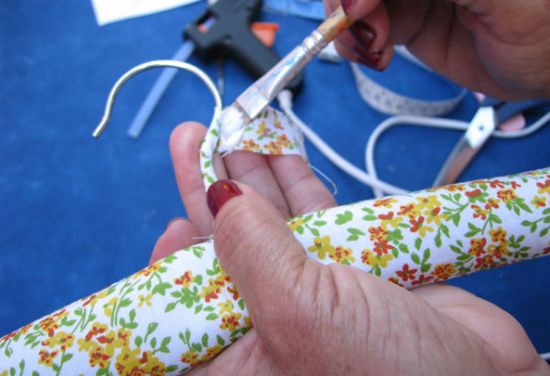 Em seguida, corte outra tira, aplique cola para tecido na ponta, com o auxílio do pincel, e comece a enrolar ao redor do gancho. E ao final, cole a ponta.