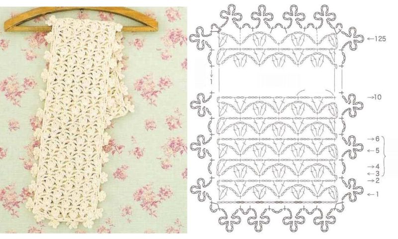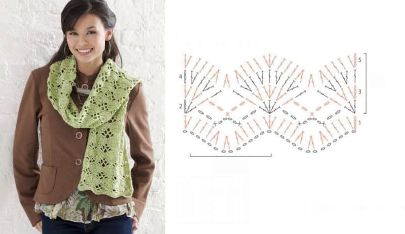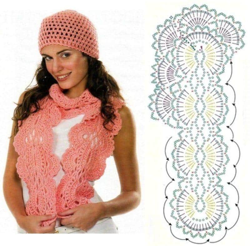 Neste cachecol você deve fazer correntinhas a mais, pois a ondulação dos pontos diminui o tamanho. Faça um cordão grande e se sobrar, ao final, você desmancha o que sobrou até chegar ao primeiro ponto. Faça uma carreira com pontos altos, mas puxando 2 pontos juntos onde o gráfico indica e fazendo 3 pontos altos juntos onde também o gráfico pede. Na próxima carreira você deve fazer 5 pontos altos no 2° ponto alto do grupo de 3 anteriores e correntinhas e pontos baixos como está no gráfico. Vá seguindo o gráfico até chegar ao tamanho que você quer para o cachecol.
