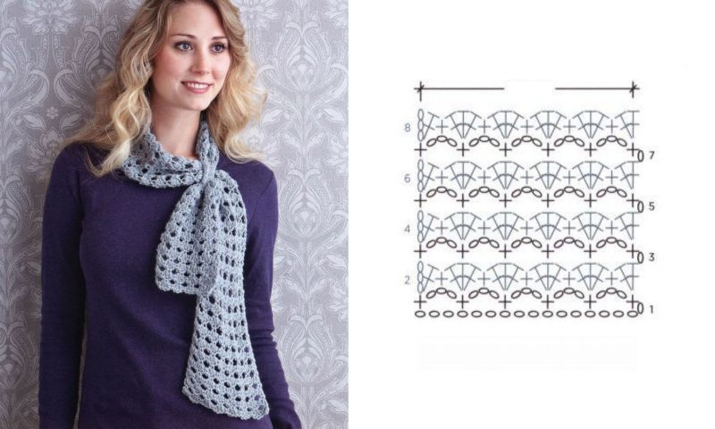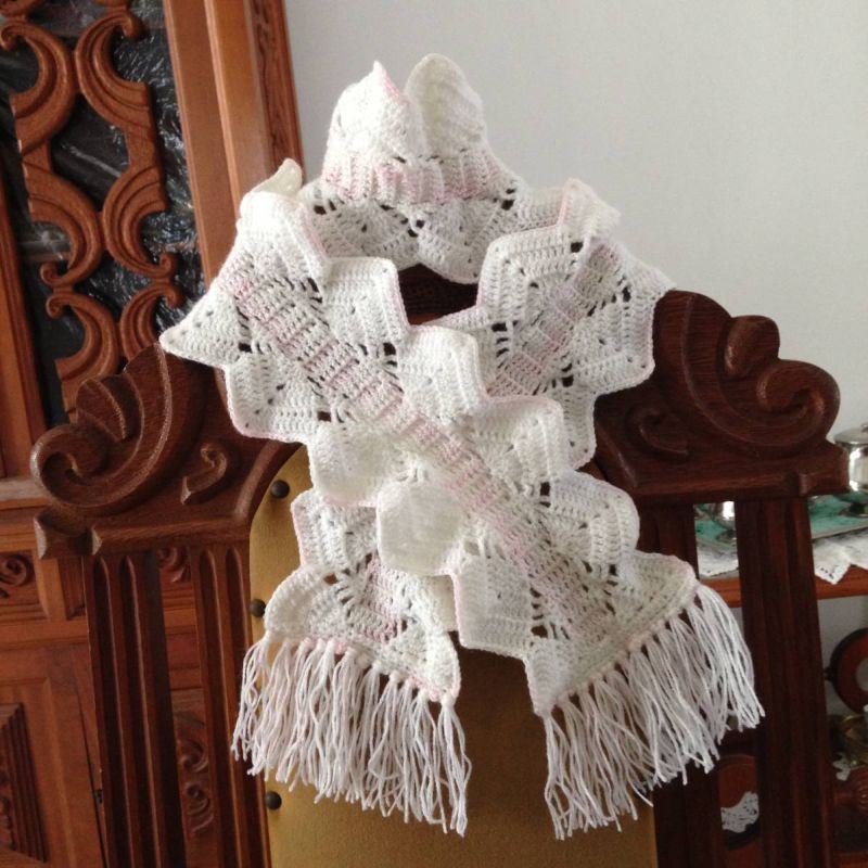 Este cachecol em crochê é muito fácil de ser feito, basta fazer um cordão de correntinhas até chegar à largura que se quer para o cachecol. Faça um a carreira com 1 ponto baixo, 3 correntinhas, pulando 2 correntinhas. Na próxima carreira faça 3 pontos altos no ponto baixo e 1 ponto baixo nas correntinhas. Siga este esquema até chegar ao tamanho desejado para o eu cachecol.