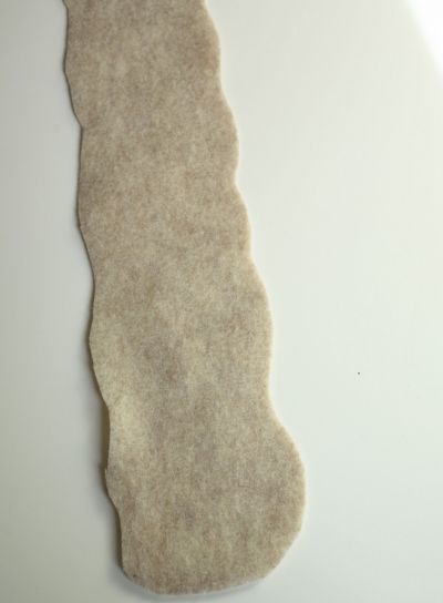 Comece cortando uma tira larga para ser a base de seu cachecol. Lembrando que você deverá cruzar as pontas da tira na parte da frente de seu corpo. Depois faça um corte sinuoso ao redor de toda a tira. Reserve.