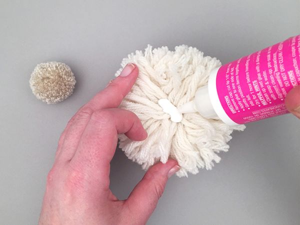 Em seguida, retire a lã que estava segurando os fios separadamente, abra os fios e aplique cola para tecido. Depois cole o pompom menor em meios a estes fios maiores.