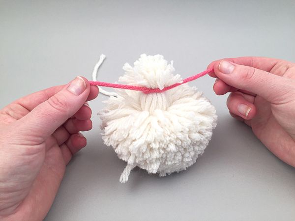 Em seguida, pegue um pompom maior, separe alguns fios e amarre-os com outro pedaço de lã.