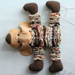 Em seguida, monte uma perna do cachorro costurando fuxicos na patinha. Faça o mesmo processo com todas as patinhas.