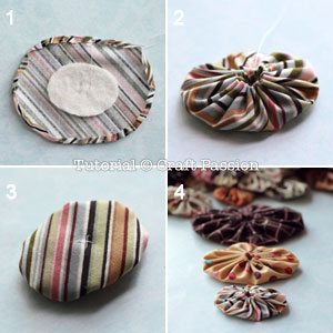 Em seguida, faça os fuxicos, fazendo uma barrinha antes de alinhavar a borda e criar o seu fuxico. Coloque dentro de cada fuxico um pedaço de feltro, para ficar firme.