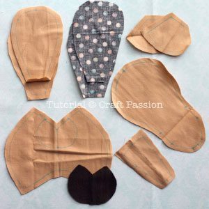 Comece separando todos os materiais que você vai utilizar em seu artesanato. Depois transfira as partes do molde para as respectivas cores dos tecidos escolhidos.
