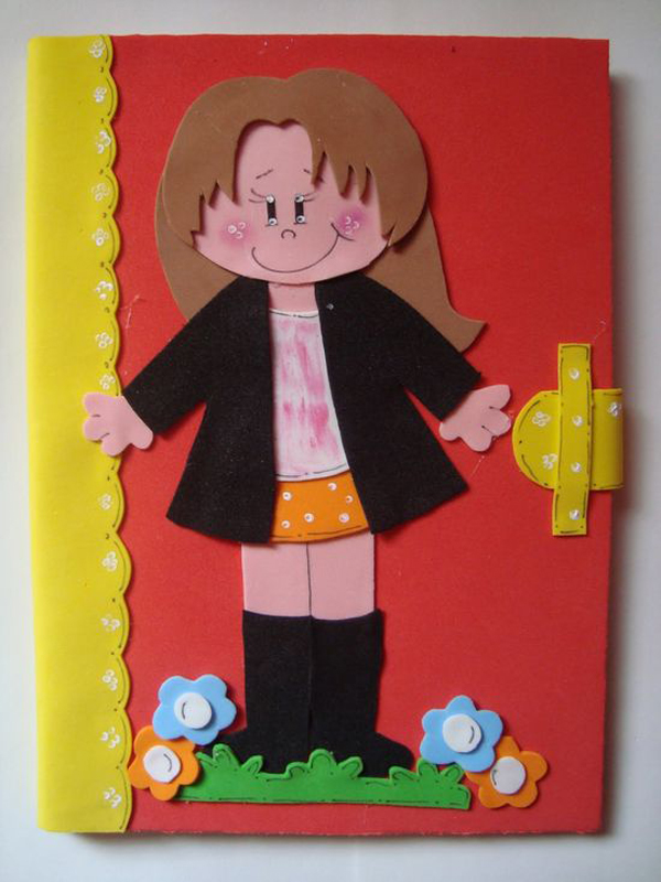 Comece separando todos os materiais que você vai utilizar em seu artesanato. Transfira as partes do molde para as respectivas cores de EVAs, com o auxílio do palito para churrasco, para não ficar marcas de lápis ou de caneta nos contornos das partes de EVA. Recorte as partes e monte o menino ou a menina, colando as partes menores primeiro e, depois, colando as partes maiores. Com as canetas coloridas, faça os detalhes da carinha e da roupa. Cole os enfeites. Encape o caderno com o EVA. Para finalizar a sua peça, cole o menino ou a menina de forma centralizada na capa do caderno. Se quiser, cole outros enfeites na capa. E está pronto!