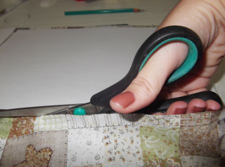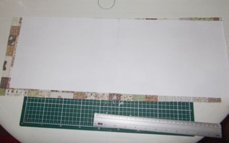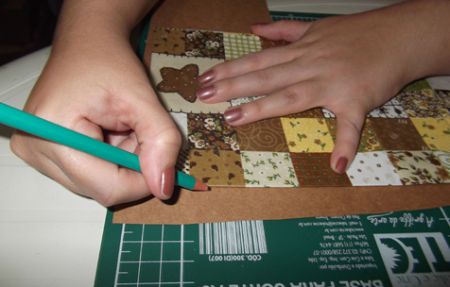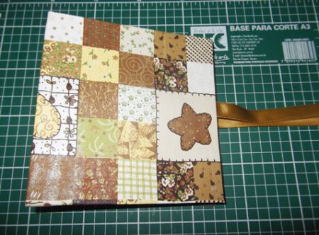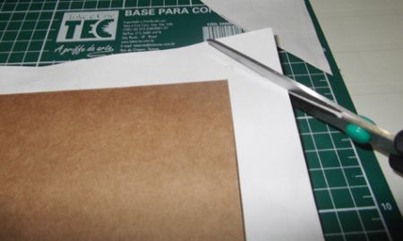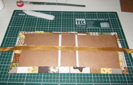 Com o tecido já seco, cole os pedaços do papel Kraft que devem ter medidas de 15×15 cm (2 pedaços) e 5×14,5 cm (5 pedaços). Mas marque antes os pedaços serão colados. E deixe um espaço de 0,5 cm entre um pedaço e outro de papel.