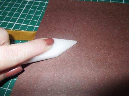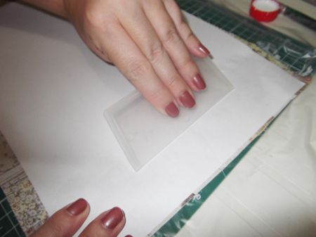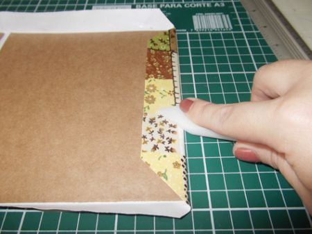 Passe a cola para artesanato nas abas e alise com a dobradeira ou espátula para colar bem.