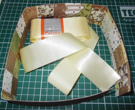 Para fazer a parte de dentro da caixa use os retalhos do tecido. Faça todas as partes e decore da forma que preferir. Aqui foi usado tecido na parte de dentro e fita larga e passa fita na parte de fora.