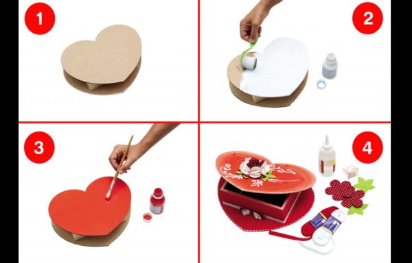 Comece separando todos os materiais que você vai utilizar em seu artesanato. Transfira o molde do coração para o papelão, lembrando-se cortar 2 corações, com um com tamanho maior que o outro, para ser a tampa. Corte 2 tiras no papelão, para ser a lateral da caixa e a lateral da tampa. Cole as tiras na lateral da base da caixa e também na tampa. Pinte a base da caixa e pinte também a tampa, com as cores desejadas. Para finalizar a sua peça, decore a tampa da caixa com a tinta em alto-relevo. E está pronto!