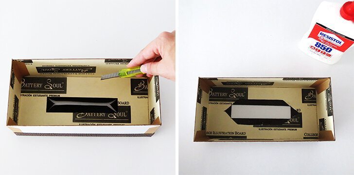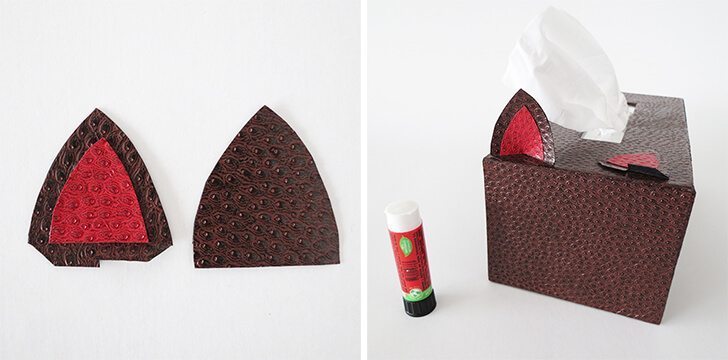 Cole a parte interna da orelha, corte e dobre a base, curvando-a, e cole em uma das pontas da caixa.