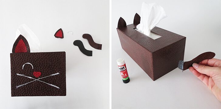 Para finalizar a sua peça, cole os olhos, bigodes, focinho e rabo do gatinho. E está pronto! Por esta peça ser removível, sempre que a caixa de lenço acabar você pode tirar de cima a parte do gatinho e posicionar em outra caixa de lenço.