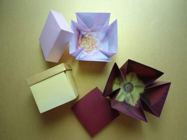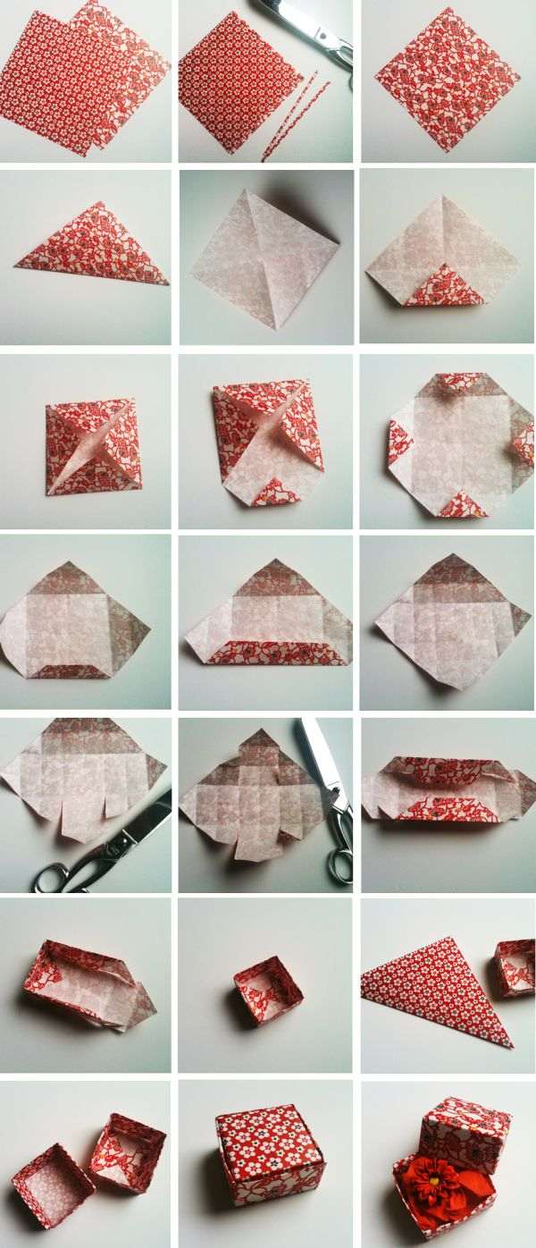 A sua caixa de presente feita de papel pode ser conseguida facilmente e, com você cortando um quadrado de papel. Dobre este quadrado várias vezes e corte algumas partes da borda, para conseguir dobrar, colar e criar a sua caixa. A tampa da caixa é feita da mesma maneira.