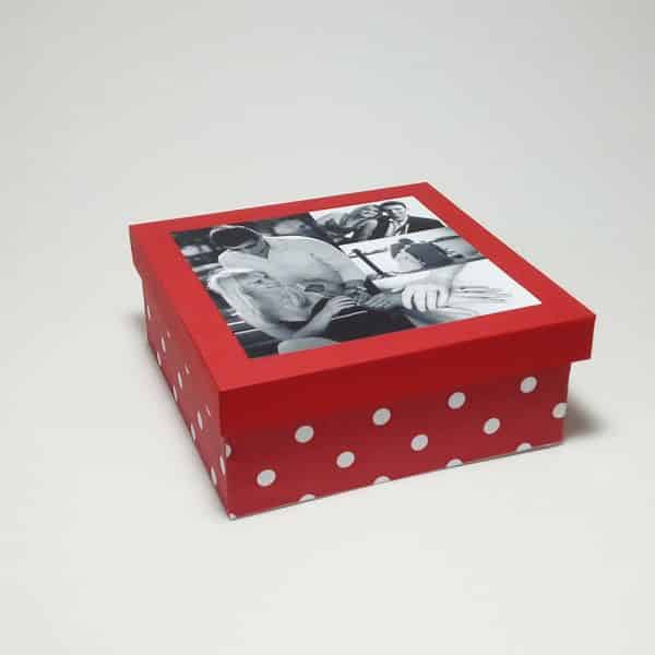 A caixa de presente com fotos é conseguida com você colando fotos sobre uma caixa (pintada ou não), utilizando uma cola Cascorez.
