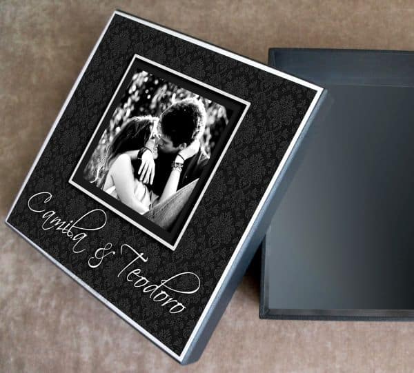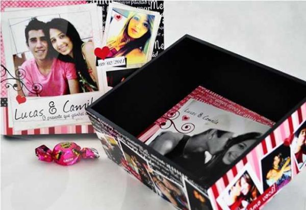 Você pode colar as fotos de vocês dois em uma caixa, usando a cola Cascorez, como já foi falado, e colar uma foto até no fundo da caixa.