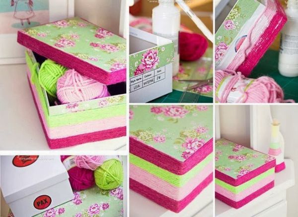 A sua caixa de presente de papelão pode ser decorada com linha ou com lã, se você possuir muito deste material em sua casa e não saiba o que fazer com estes restinhos. Aplique cola na caixa e vá enrolando lã ou linha ao redor da caixa.