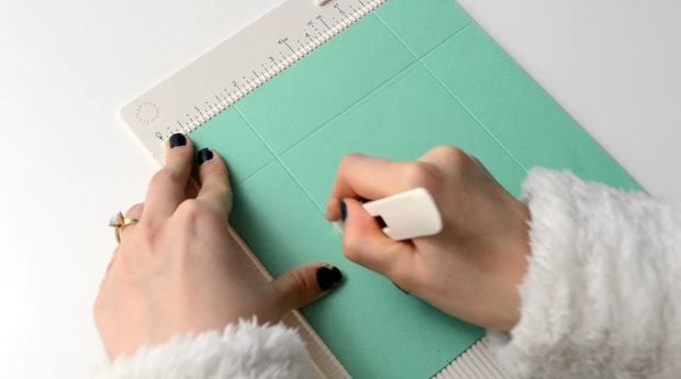 Corte um quadrado em um dos papéis estruturados escolhidos. Faça uma marca ao redor de todo o quadrado de papel e vinque esta marcação. Corte o quadrado com o tamanho que você quiser, para acomodar o seu presente.