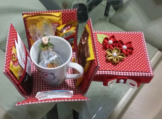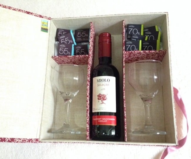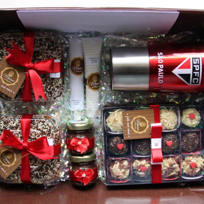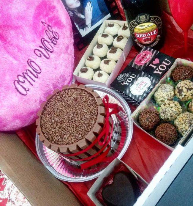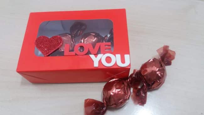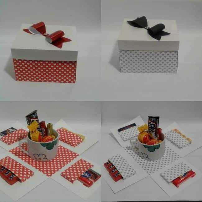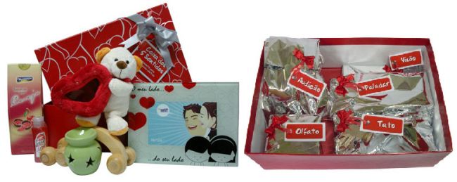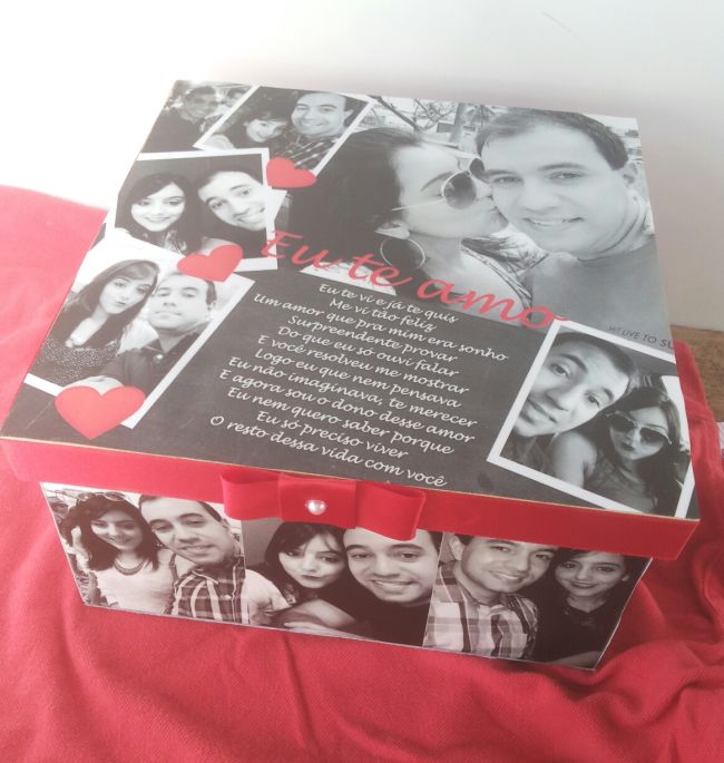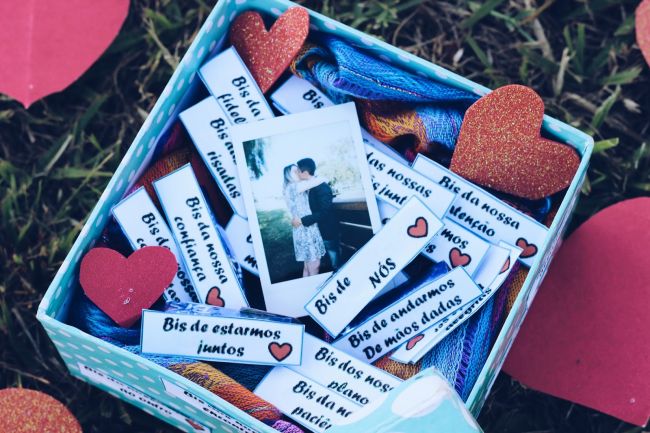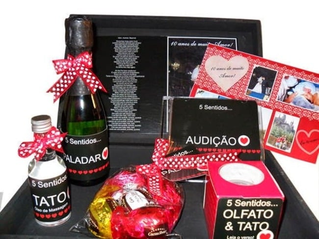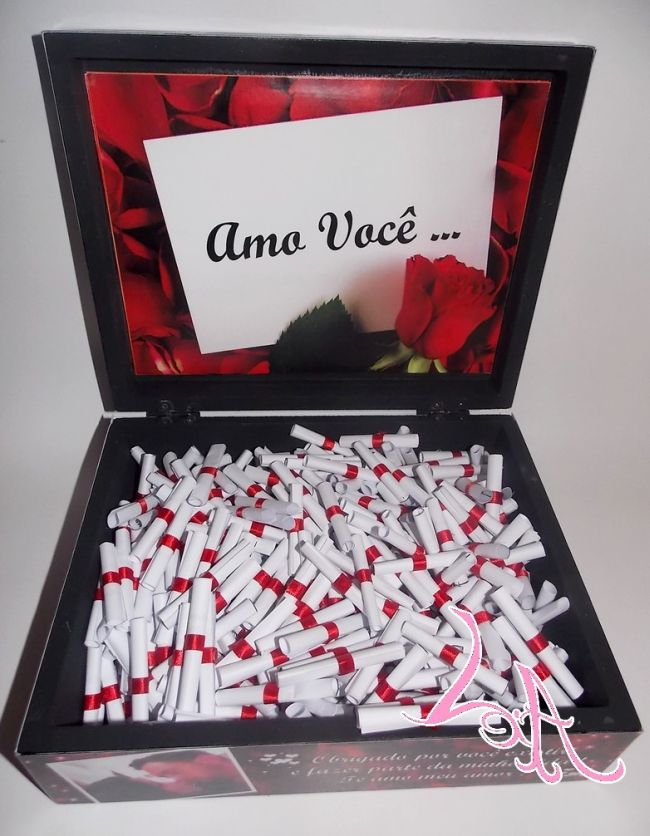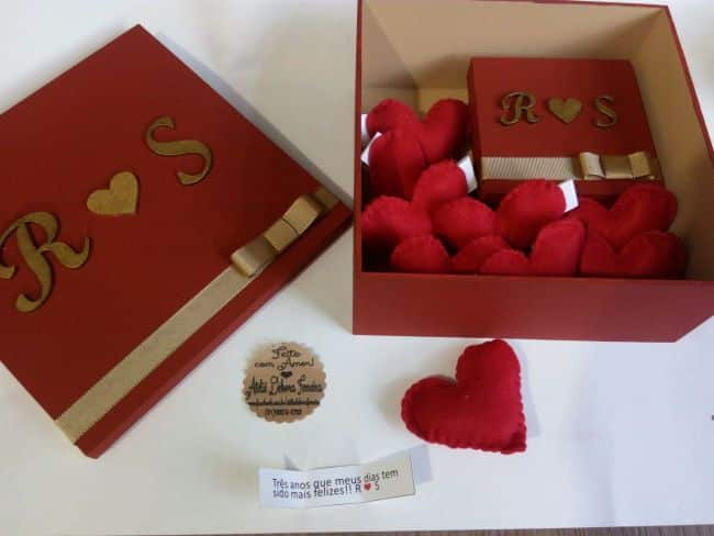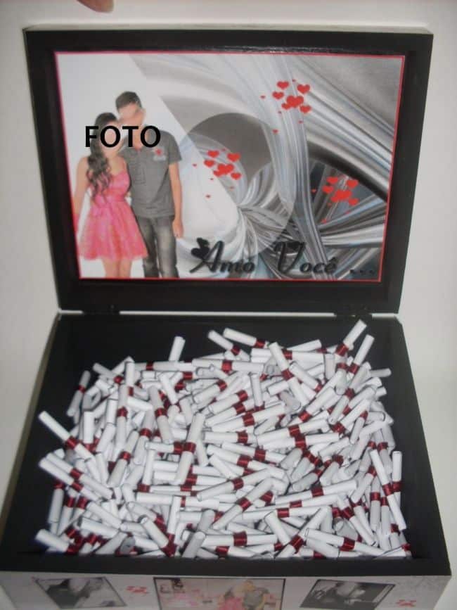 Você pode colocar o que você quiser dentro da caixa para o seu amor, até dinheiro, se estiver sobrando e ele estiver precisando. Canecas, guloseimas, produtos de beleza, bebidas, fotos, itens de time de futebol, entre muitos outros.
