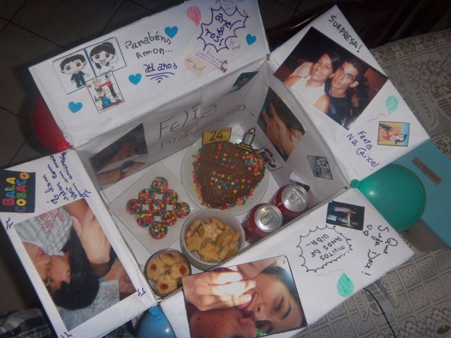 A festa na caixa é uma caixa que contém bolo de aniversário e guloseimas para o presenteado. Você pode montar uma para o seu amor.