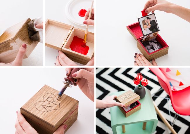 Pinte uma caixinha de madeira e coloque fotos de você dois dentro da caixa.