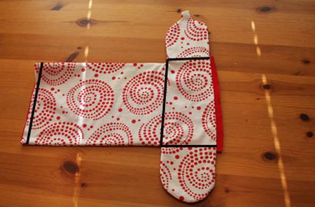 Agora, prenda com alfinetes para costura a abertura com as sobras de tecido para dentro, e depois passe uma costura reta.