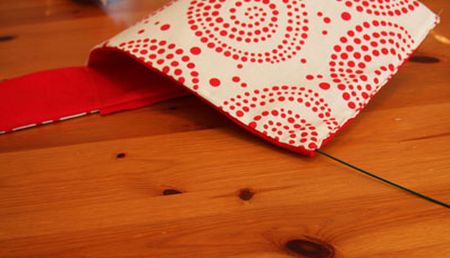 Logo após, costure ao redor de toda a peça, pelo lado do avesso do tecido, mas deixando a base aberta, para virar posteriormente. Depois vire a peça para o lado do direto do tecido e acomode a tela de plástico dento da peça.