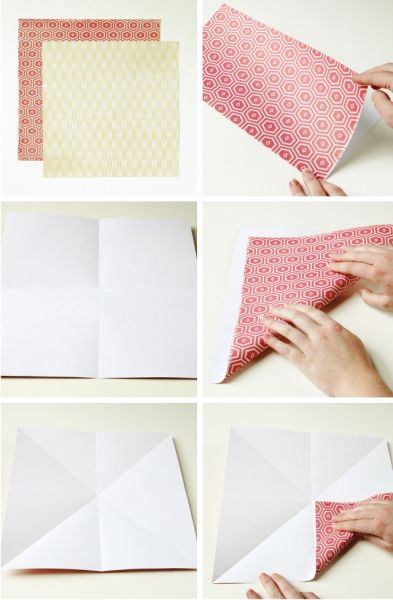 Em seguida, dobre as outras quatro pontas do quadrado em direção ao centro. Depois dobre duas extremidades da peça criada, para vincar. Abra o papel e abra duas pontas opostas. Dobre as laterais de uma das pontas para dentro, para criar um dos lados de sua caixinha.