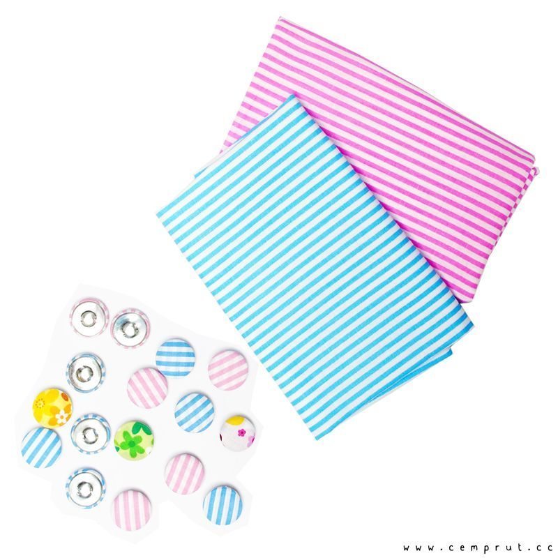 Comece separando todos os materiais que você vai utilizar em seu artesanato. Se você for encapar em casa os botões, corte pedaços dos tecidos escolhidos, com tamanho que consiga encapar o botão e ainda ter uma boa sobra.