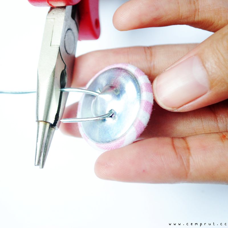 Passe um pedaço de arame pelos furos do botão e corte os excessos, com o auxílio do alicate com corte.