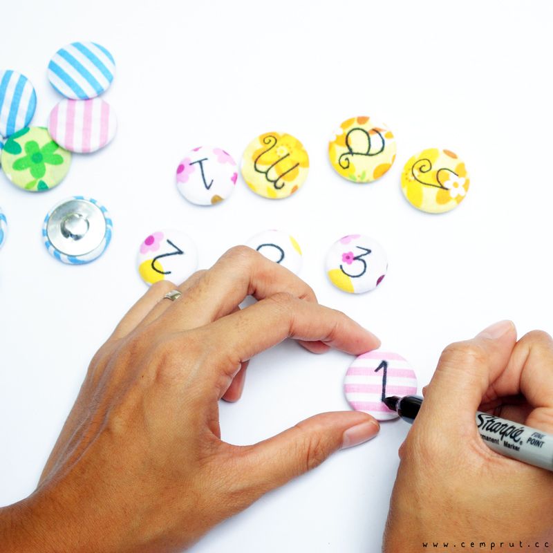 Marque os números nos botões, com o auxílio da caneta preta com ponta grossa.