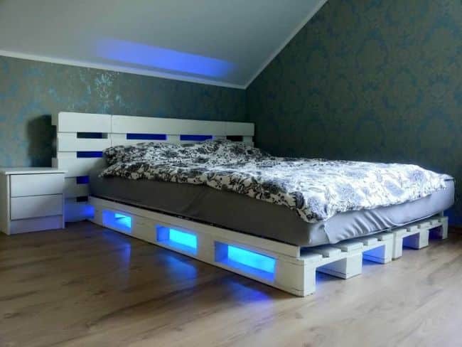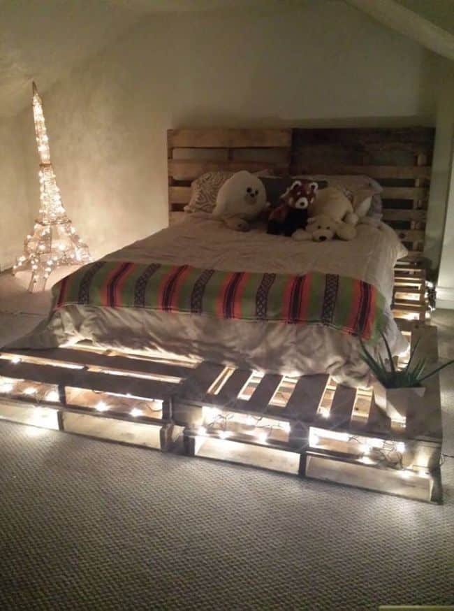 6 – Um toque de personalidade usando iluminação na base da cama de palete