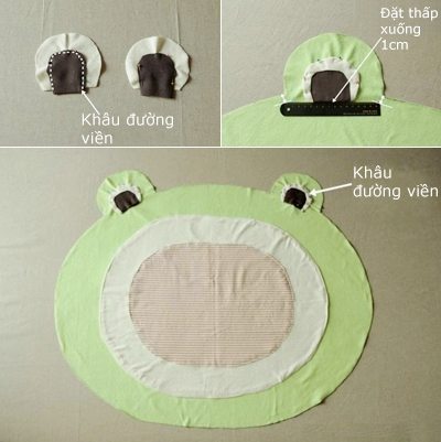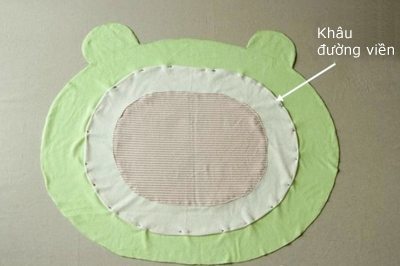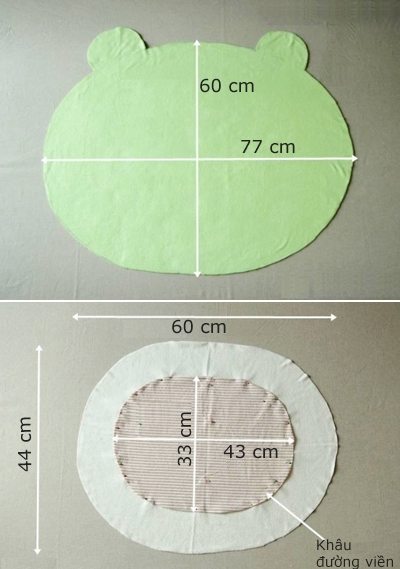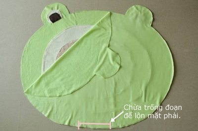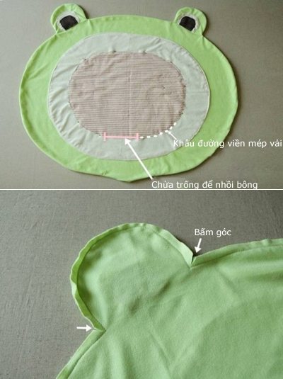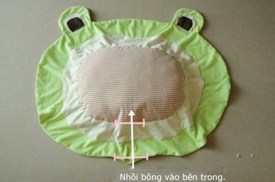 Comece cortando o tecido verde em formato de cabeça de sapo estilizada (formato oval), e com tamanho de 77 cm de comprimento por 60 cm de largura (altura). Depois corte em outro tecido um formato oval com tamanho de 60 cm de comprimento por 44 cm de largura (altura). E então corte uma terceira parte com tamanho de 43 cm de comprimento por 33 cm de largura (largura). Prenda a parte menor sobre a parte média com o auxílio dos alfinetes para costura e depois passe uma costura reta, mas deixando uma abertura.