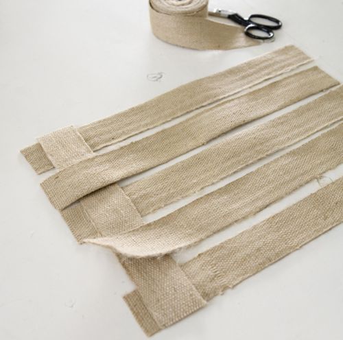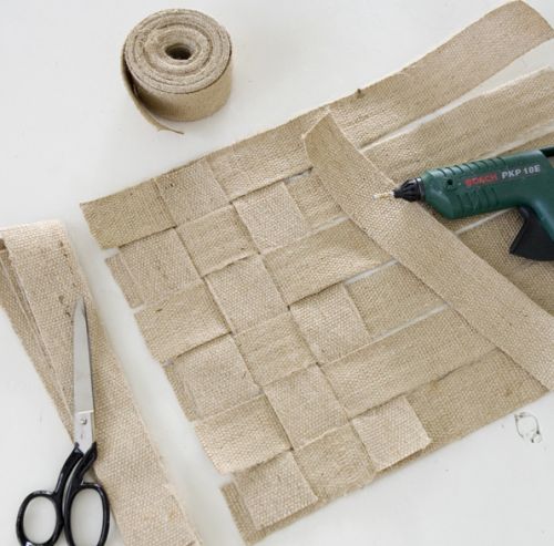 E continue trançando as fitas menores e colando suas tiras de juta até chegar ao final. Não é necessário utilizar muita cola para não escorrer pelas laterais, porém você deve colar o suficiente para que o caminho fique com todas as peças bem “acomodadas”.
