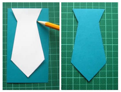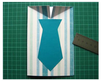 Comece fazendo o cartão, com o papel estruturado escolhido com o tamanho de sua preferência, e imprimindo o molde da gravata e transferindo para o papel escolhido, que deve ter cor ou estampa contrastante com a cor ou estampa do papel utilizado para fazer o cartão. Lembrando que esta gravata deve ter tamanho um pouco menor do que o tamanho da capa do cartão. E recorte a gravata.