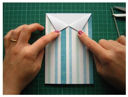 Logo após, dobre as abas conseguidas com o corte, para fora, para a parte externa da capa do cartão e vinque com os dedos.
