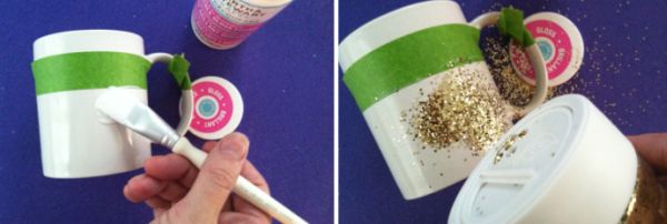 Em seguida, posicione pedaços de fita adesiva nas partes da sua caneca de porcelana que você quer proteger do revestimento de glitter que você vai fazer posteriormente. Depois aplique uma camada generosa de cola para decoupage com acabamento brilhante. Então comece a jogar o glitter escolhido sobre a sua caneca de porcelana, sobre a parte com cola para decoupage.