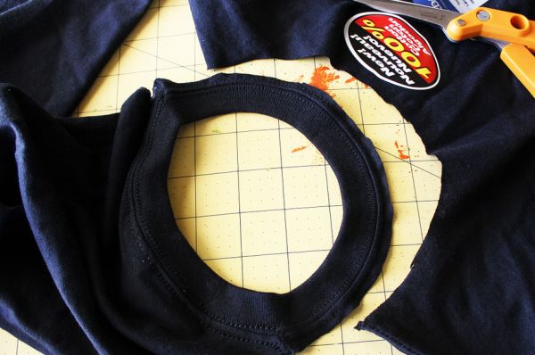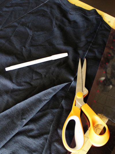 Comece riscando, com o auxílio do lápis para costura e da régua, do ombro até a barra na camiseta preta, mas formando um trapézio, com a parte de cima tendo um risco quase perto do colarinho e a parte de baixo chegando à lateral da camiseta. Depois corte, com o auxílio da tesoura, e dos dois lados da peça.