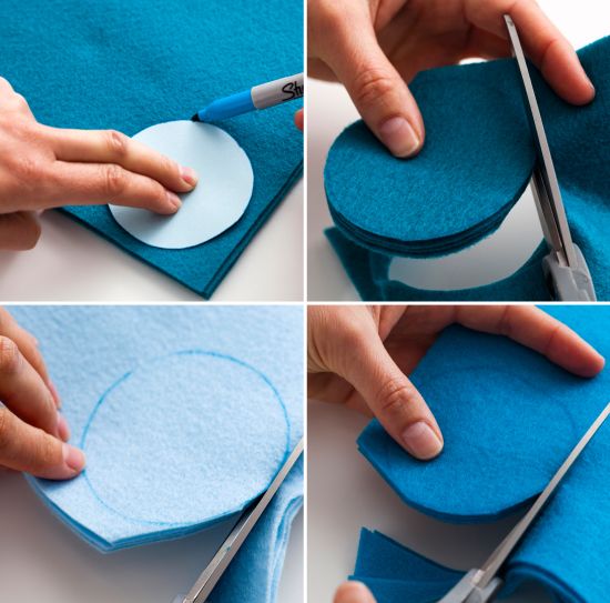 Em seguida, transfira este molde de círculo para os feltros escolhidos e recorte todas as peças, com o auxílio da tesoura.