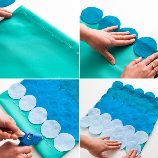 Agora, aplique um fio grosso de cola quente na parte da frente da capa da almofada e aplique a primeira camada de círculos de feltro, com um círculo ao lado do outro. Depois continue colando camadas de círculos, porém intercalando os círculos, posicionando-os nos intervalos dos círculos colados anteriormente. Deixe a cola secar muito bem ao final.