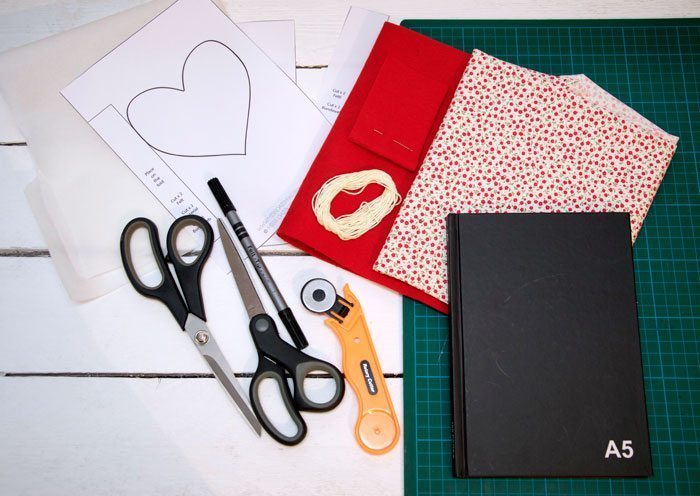 Comece separando todos os materiais que você vai utilizar em seu artesanato. Meça em sua agenda ou caderno o tamanho quando aberto. Depois transfira as partes do molde para as respectivas cores do tecido e feltro escolhidos.