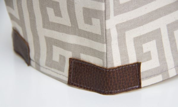 Logo após, se for preciso faça os acertos com a tesoura nos cantos e faça a bainha da peça. Corte quatro tirinhas de couro e costure nos quatro cantos. E está pronto!