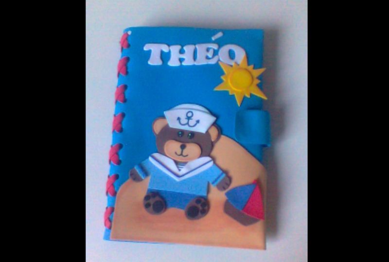 Transfira as partes do molde para as respectivas cores de EVAs, com o auxílio do palito para churrasco, para não ficar marcas de lápis ou de caneta nos contornos das partes de EVA. Monte o menino de EVA ou a menina de EVA, de acordo com a sua preferência. Reserve. Meça o tamanho da caderneta quando ela está fechada, de um lado a outro, passe esta media para o EVA e deixe uma sobra, para poder encaixar a caderneta com folga. Cole as bordas externas de duas tiras largas por dentro, para ser a aba que vai receber a caderneta. Cole o menino ou a menina na capa da caderneta e cole os outros enfeites. Para finalizar a sua peça, se você quiser, corte uma tirinha de EVA, cole uma parte atrás e cole um pedaço de velcro na ponta da tira e o outro pedaço na capa. E está pronto!