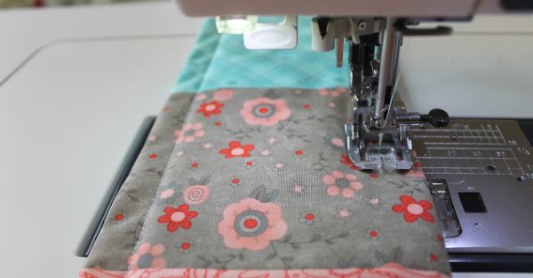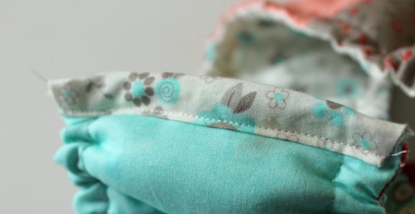 Em seguida, posicione uma parte sobre a outra e prenda com alfinetes para costura, com a manta acrílica fixada em uma das partes. Passe uma costura reta ao redor de toda a peça, mas deixando uma ponta sem costura.