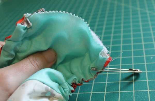 Em seguida, utilize um alfinete de segurança para prender um pedaço de elástico na capa e outro alfinete de segurança na outra ponta do pedaço de elástico.
