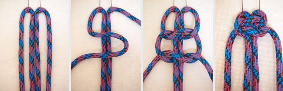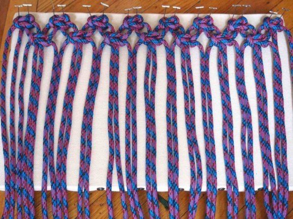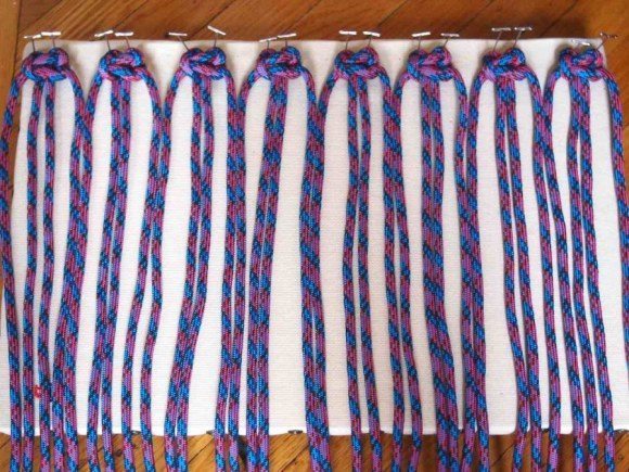 Comece posicionando o suporte escolhido em uma parede ou local onde você possa ter espaço suficiente para manipular as cordas. Depois corte vários pedaços de corda bem compridos e posicione um número par de cordas, queime as pontas com o isqueiro, e comece a trabalhar com a primeira dupla de cordas. Pegue a corda da esquerda, e faça um “movimento” levando a corda para o lado do direito. Então pegue a corda da direita e passe pela laçada feita, voltando a ponta para a direita. E puxe o nó.