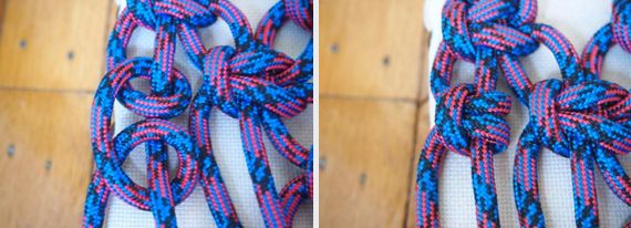 Agora, quando chegar ao final da fileira, faça um acabamento nas laterais, pegando a corda da extremidade e faça duas laçadas e passe a segunda corda por dentro. Depois puxe a corda.