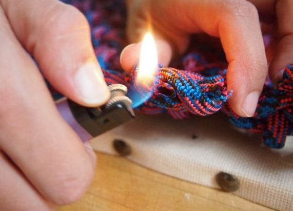 Logo após, para finalizar a sua peça, na última carreira de nós, vá colando com cola quente cada nó, para ficar bem firme. Depois corte as cordas e então queime com o isqueiro, para não desfiar. E está pronto!