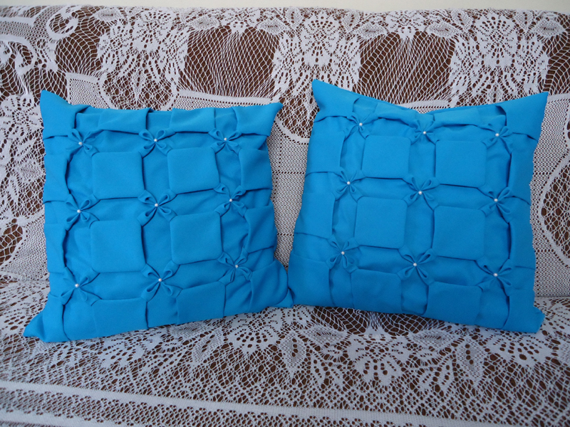 Para facilitar o seu trabalho, risque no avesso do tecido quadradinhos com o mesmo tamanho, em toda a parte que você quer que seja a frente da sua almofada. Faça antes um teste em um pedaço de tecido separado, para saber o quanto de tecido deverá cortar, pois ao final do trabalho, o tecido inicial ficará menor, porque o ponto capitonê franze o tecido. Passe a agulha com linha pelo quadrado, no avesso do tecido, e puxe a linha com cuidado. Leve a agulha para o lado do direito do tecido e costure uma pérola, para fazer um bonito acabamento.