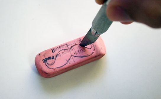 Em seguida, com o auxílio do estilete, recorte todo o contorno do bigode que você desenhou na borracha. Mas não corte tudo, deixe uma “base” na borracha, vá tirando as sobras da borracha ao redor do bigode. E faça esta parte com muita paciência e cuidado.